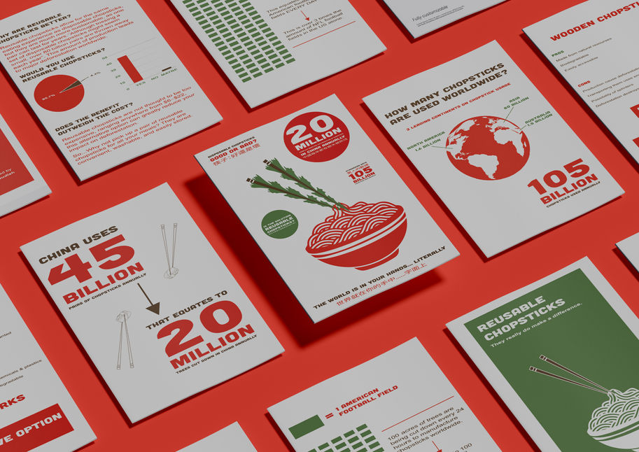 The work highlights how the mass production of single-use chopsticks contributes significantly to the loss of forests, a consequence that is rarely considered in daily consumption habits. By presenting statistics in a clear, engaging format, the design encourages viewers to reconsider the environmental cost behind convenience.